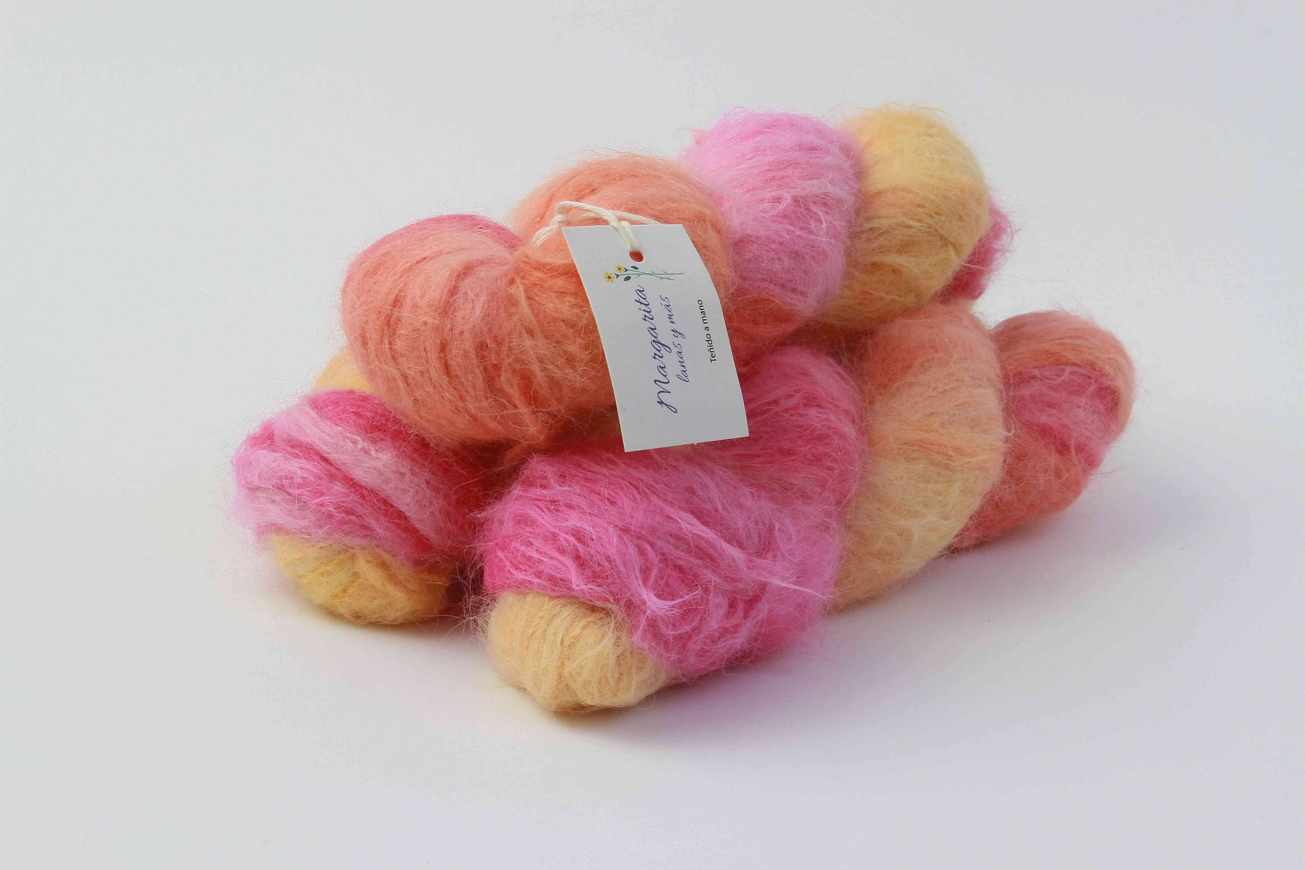 Base de origen peruano, teñido a mano, en pequeñas cantidades, cada madeja es única e irrepetible por ser un producto hecho a mano.